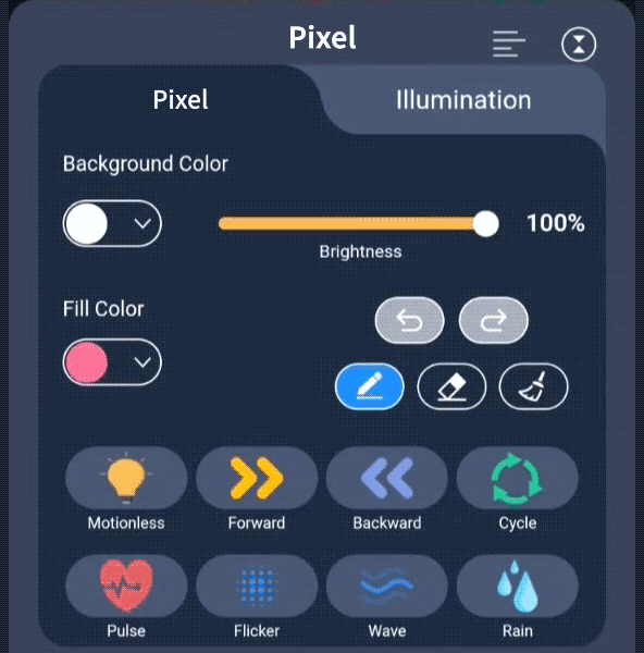 With Pixel’s doodle feature, you can easily customize the LED layout to suit your needs. Just tap the “Layout” button to instantly switch between three display modes: