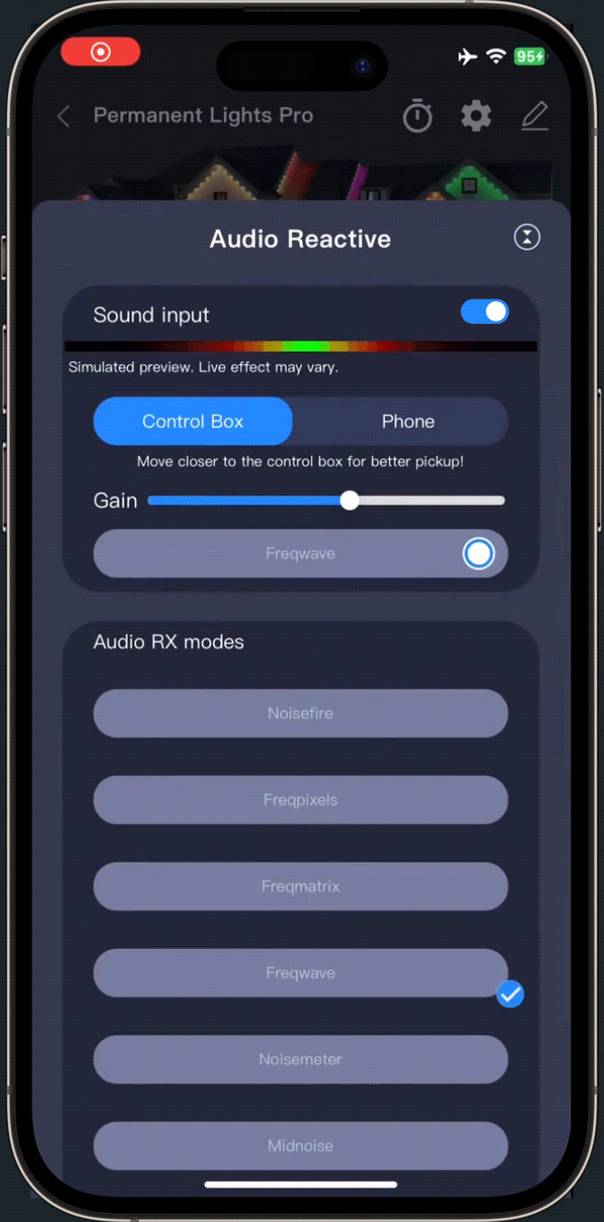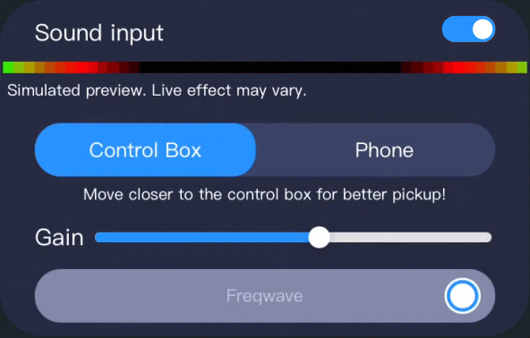 ON – Lights react in real time to audio captured from the control box MIC or phone MIC.