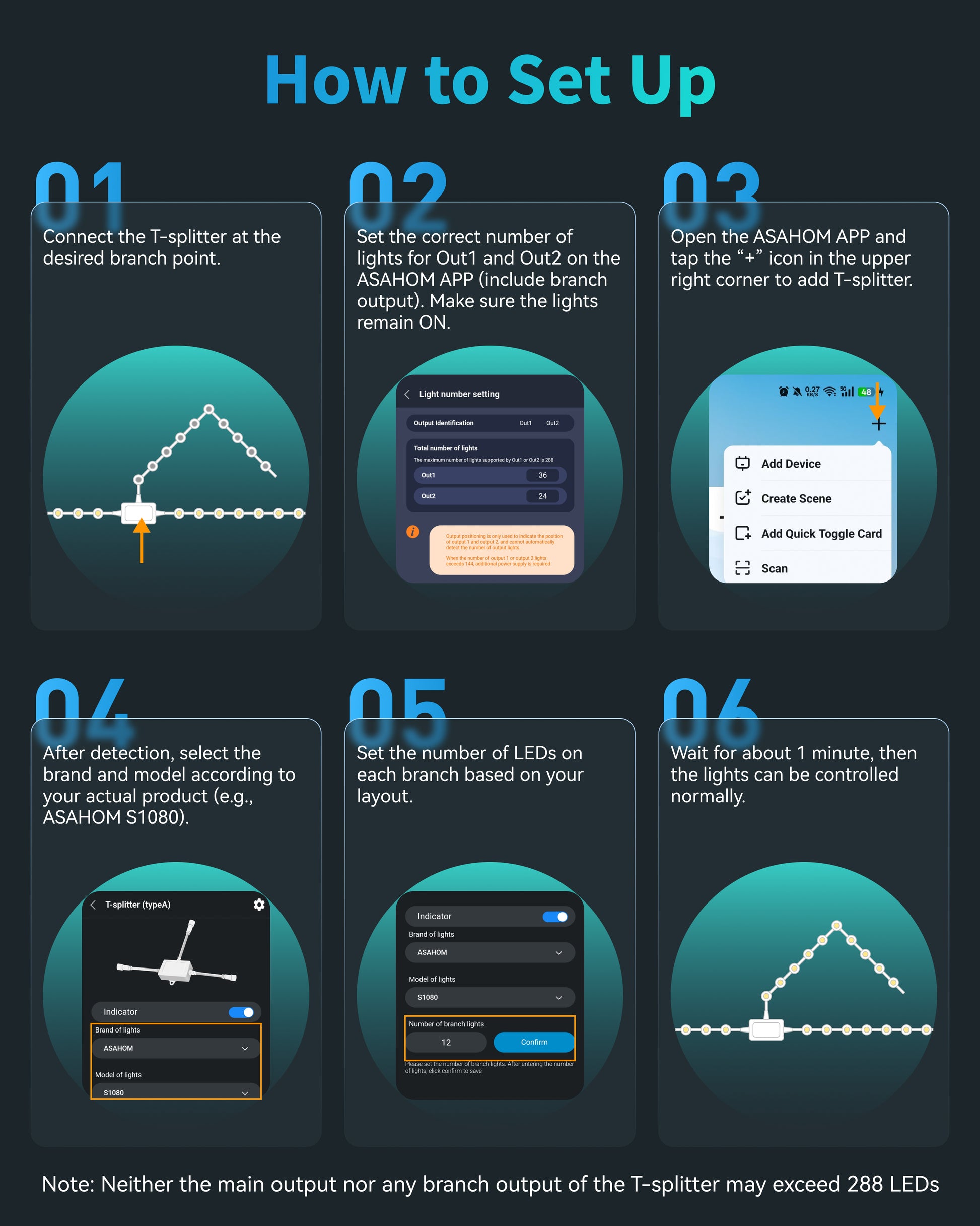 How to Set Up: 1. Connect the T-splitter at the desired branch point. 2. Set the correct number of lights for Out1 and Out2 on the controller. Make sure the lights remain ON. 3. Open the ASAHOM App and tap the “+” icon in the upper right corner to add a T-splitter. 4. After detection, select the brand and model according to your actual product (e.g., ASAHOM S1070). 5. Set the number of LEDs on each branch based on your layout. 6.Wait for about 1 minute, then the lights can be controlled normally.