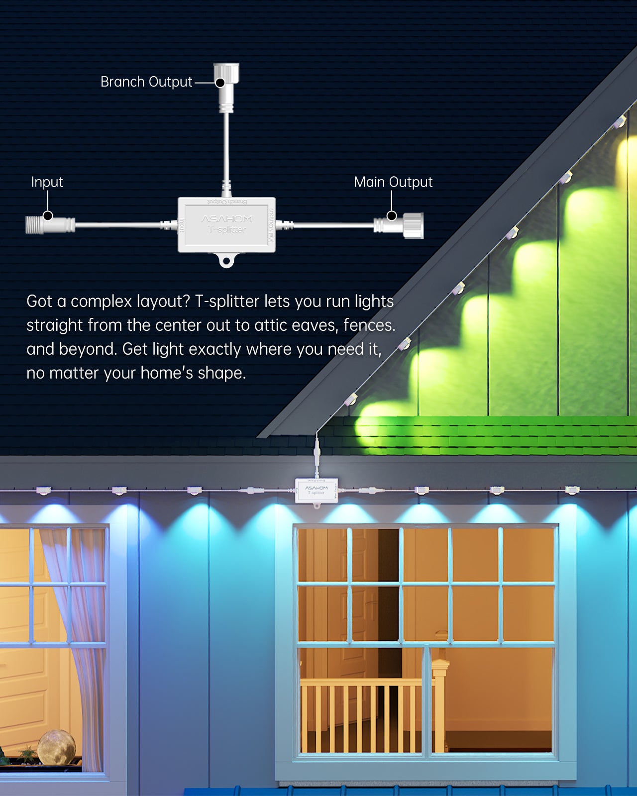 When to Use: When you want to run two light strings in opposite directions from the same controller Ideal for “center-out” layouts on eaves, fences, or rooftops